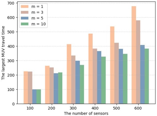 Figure 11 shows the travel time of the MUV returning to the BS after departing from the BS to serve all the UAVs requiring battery replacement when the number of SNs increases from 100 to 600 by 100 under different numbers of UAVs. It can be seen that with any number of UAVs, the travel time of the MUV gradually increases with the increase in the number of SNs. However, with any number of SNs, the travel time of the MUV gradually decreases with the increase in the number of UAVs. This is because in the case of a given number of UAVs, as the number of SNs increases, the number of data collection hover points visited by UAVs increases, resulting in a greater energy consumption of the UAVs. Consequently, the frequency of battery replacement for the UAVs increases, and the scheduling of the MUV on the fixed path