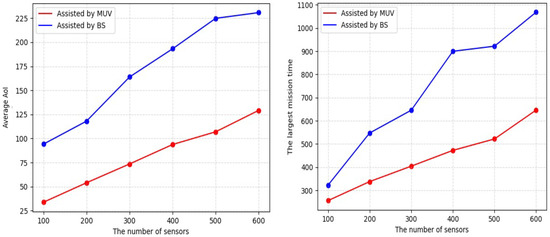 Figure 12a,b show the average AoI and the largest mission time with or without an MUV to replace the battery for the UAVs when we set