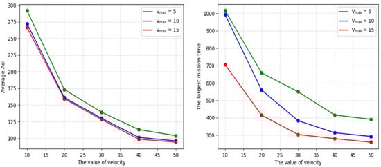 Figure 13a,b show the average AoI and the largest mission time under