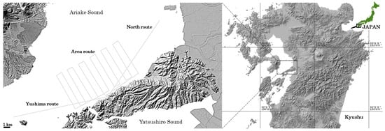 The study area in Ariake Sound, Japan. Solid lines indicate the North, Yushima, and Area flight routes on the Digital Map (Basic Geospatial Information) published by the Geospatial Information Authority of Japan.