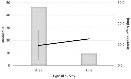 Comparisons of the average number of individuals (bar chart) and detection efforts (line chart; mean ± SEM) between the area and line surveys.
