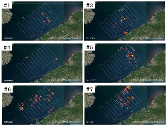 Surveys were conducted in an area of 120 km2 off the Japanese coast in the marine waters of Ariake Sound (Figure 1) between June 2022 and January 2023. The launch location for the VTOL drone was set at an off-limit area of 30 m × 30 m at Ohtao Port (32°38′23.4″ N, 130°28′39.9″ E).