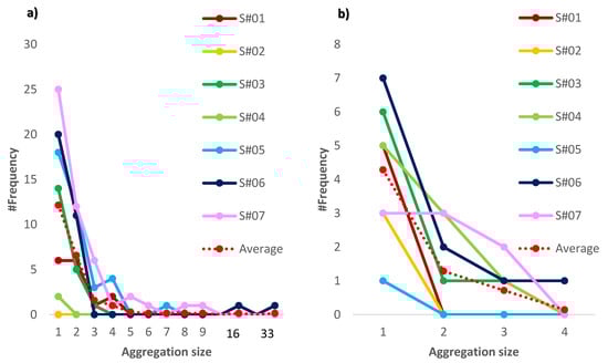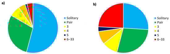 Proportions (%) of aggregation size frequency (a) and individual numbers (b) belonging to solitaries and aggregations of 2, 3, 4, 5, and ≥6 individuals in the area surveys.