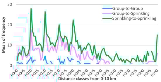 Comparisons of distance-class distributions of group-to-group, group-to-sprinkling, and sprinkling-to-sprinkling aggregations. The distance class was set at a 100-m interval, with D000 representing the distance range from 0–99 m.