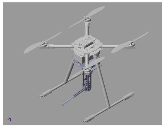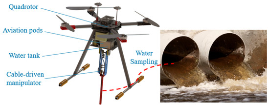 The 3D virtual model of the developed UAM is shown in Figure 1, which contains three main components, i.e., unmanned quadrotor, water sampling system, and cable-driven manipulator. The working principle of the prototype is to control the quadrotor to hover near the drain outlets, then manipulate the cable-driven manipulator to insert its end effector into the pipe mouth to collect water samples.