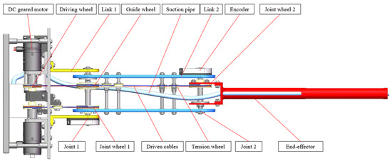 As illustrated in Figure 2, the length of the fully extended robotic arm is 515 mm, the lengths of links 1 and 2 are 115 mm and 150 mm respectively, and the length of the end effector is 250 mm. The manipulator provides a light arm with cable-driven mechanisms that has two parallel joints. Each joint is driven by a DC geared motor installed in the aviation pods. A pair of driven cables (red and blue lines) are provided to control a joint rotating in two directions, which are kept under tension by the tension wheels. As a result, the joints can be controlled remotely through the driving wheels and guide wheels. Moreover, the manipulator also incorporates a suction pipe that draws water into the water tank installed in the aviation pods.