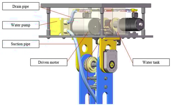 The inner structure of the aviation pods is shown in Figure 4, which reveals the water collection mechanism. The water from the drain outlets is collected through the suction pipe, and flows into the water tank through the drain pipe. A water pump provides the power to ensure the wastewater can be pumped from lower levels to higher levels. The water pump is driven by a drive motor. The size of the water tank is 100 mm, which can hold about 1 L of wastewater.