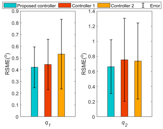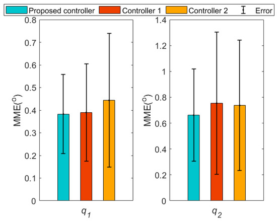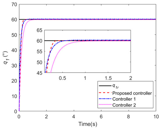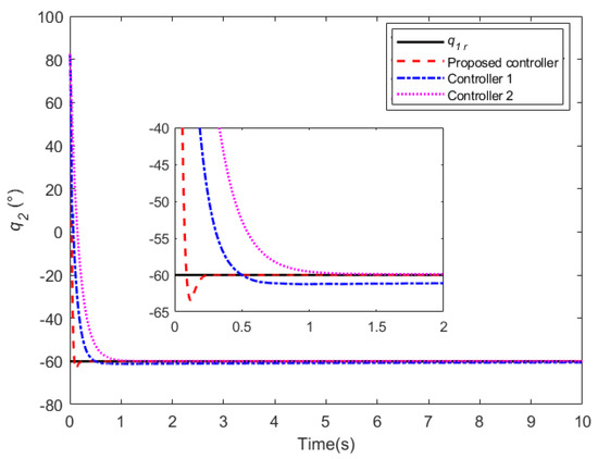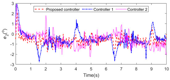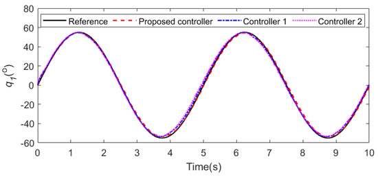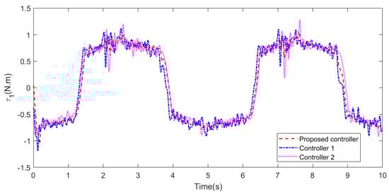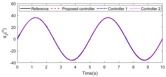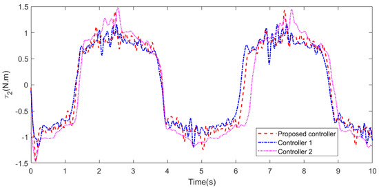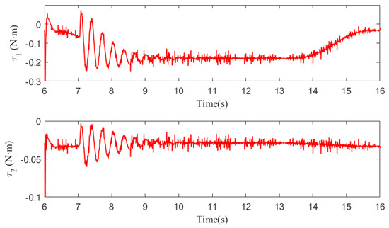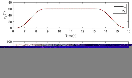 During water sampling, the initial joint angles of the cable-driven manipulator are 0 and 82.6, respectively, and other initial conditions are 0. The cycloidal curves [50] are introduced to determine the referenced trajectories of the two joint angles, with joint 1 changing from 0 to 60 in 6∼9 s and lasting for 6 s, and then returning from 60 to 0 in 14∼16 s. Joint 2 changes from 82.6 to 0 in 6∼9 s and lasts for 6 s, and then returns from 0 to 82.6 in 14∼16 s. In addition, the same disturbances as those in case 2 are introduced into the manipulator system. The simulation results are shown in Figure 24 and Figure 25. From Figure 24, it can be seen that the two joints can track the referenced trajectories better under the proposed controller. The disturbances are well suppressed owing to the LESO. Meanwhile, the control torques generated by the proposed controller are flatter and cause less damage to the actuators observed in Figure 25. In summary, the controller designed in this paper can better help the UAM to complete the task of water quality sampling.