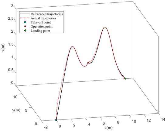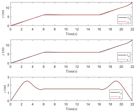Based on the quadrotor dynamics [41], a dual-loop controller is designed to achieve its trajectory tracking control. Position loops track the quadrotor’s 3D trajectory, and attitude loops stabilize its attitude. When the quadrotor arrives at the water quality sampling point, it is necessary to keep the position of the quadrotor stable in order to ensure the quality of the operation.
