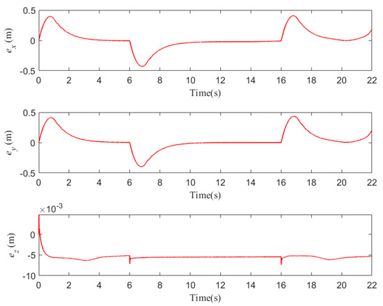 Recalling Equation (3), the position and attitude loops are coupled. Specifically, the outputs of the x and y are the referenced signals of and . The attitude tracking errors and angular velocity tracking errors are defined as