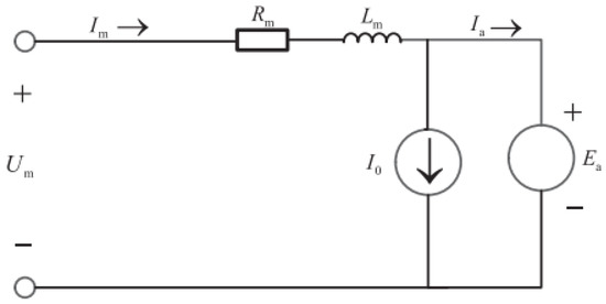 At present, the electric motor used by the multirotor UAV is a brushless DC motor. The brushless DC motor is a synchronous three-phase permanent-magnet motor that can be modelled as a permanent-magnet DC motor. A common equivalent circuit is shown in Figure 1 below. The motor-equivalent electric power supply voltage (V) and the equivalent electric motor input current (A) are calculated as follows [25]: