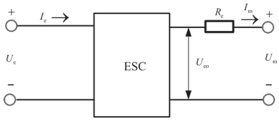 Electric modulation (also known as ESC) converts the DC voltage in the battery into a three-phase AC signal after duty ratio modulation and input into the brushless motor so that the armature generates an alternating magnetic field and drives the rotor to rotate. The equivalent circuit of electrical modulation is shown in Figure 2, where is the input voltage of electrical modulation, is the input current of electrical modulation, is the equivalent DC voltage after modulation of electrical modulation, is the internal resistance of electrical modulation, and is the maximum voltage that can be supported during normal operation of electrical modulation.