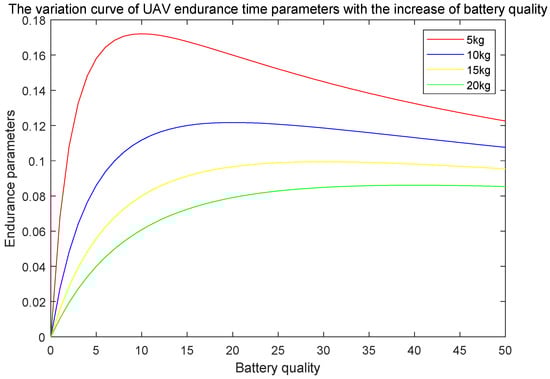 First, the optimal proportion of battery quality is verified. In Equation (5), let . When is 5 kg, 10 kg, 15 kg, and 20 kg, the relationship curve between (parameters related to battery life) and battery quality is shown in Figure 3 below: