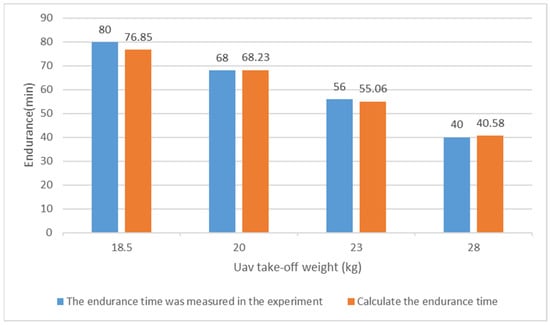 Figure 5 shows that the endurance calculated by the hovering performance analysis of the rotor UAV is basically consistent with the endurance measured by the experiment, and the error range is within 5%.