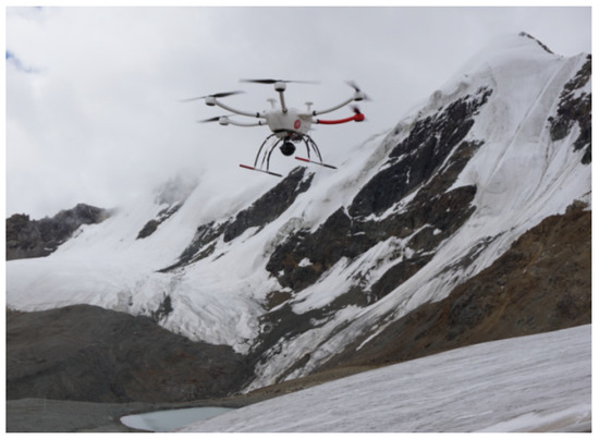 On 12 July 2020, we conducted a flight test (dual-light pod) of Skylark 3 on the Guqionggang Glacier (as shown in Figure 6). The altitude of this area is 5.6 km, and the air density is approximately 0.68 kg/m3. This UAV is equipped with a 12 s battery pack with a capacity of 25,000 mAh. The total mass of the UAV is 15.4 kg, and the flight duration of the UAV is 25 min, according to the flight experiment.