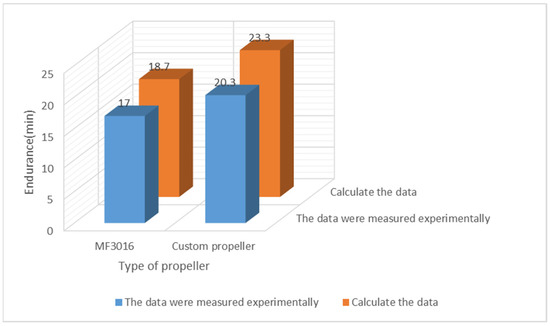 Figure 9 shows that for the UAV equipped with MF3016, the error is 10%; the endurance of the UAV equipped with a customized paddle is increased by 19.4% compared with that of the optimised propeller, and the error is 9.8%. Considering the wind resistance, frost resistance, and load consumption, the error is within the allowable range. The feasibility of the proposed optimisation method is verified experimentally.