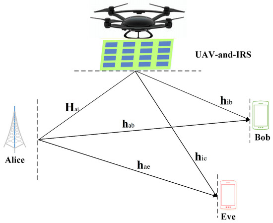 As illustrated in Figure 1, an IRS- and UAV-aided DM network is sketched, where the IRS was mounted on a UAV, and the UAV hovered at a suitable height such that the UAV could see Alice, Bob, or both. Alice was a transmitter equipped with N a antennas, Bob and Eve were the legal and illegal receivers equipped with a single antenna, respectively, and the IRS was equipped with N s passive reflecting elements.