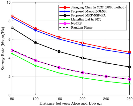 Figure 4. Secrecy rate versus the distance between Alice and Bob.