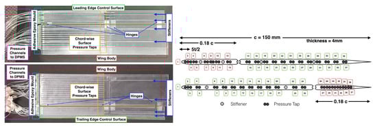 Two flat-plate airfoils with elliptical leading edges were used. One featured an LECS and the other a TECS as depicted in Figure 1 (right). The airfoils were manufactured using stereolithography, and 1 mm PVC tubes with a wall thickness of 0.4 mm were inserted into the airfoil. The control surfaces were hinged to the wing body using a pin joint. The gap on the hinge line was approximately 0.5 mm and was sealed with flexible rubber tape. Due to practical limitations, the total number of surface pressure taps was limited to 37, of which 18 were on the top surface, 18 on the bottom surface, and one at the leading edge. Tap diameters were 1 mm (driven by printing resolution limitations) and were located from the leading edge to as close to the sharp trailing edge as possible; see Figure 1 (right).