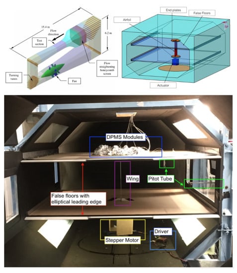 Perspective view of RMIT Aerospace Wind Tunnel (top-left) and test set-up (top-right). Schematic front view of the test section of the wind tunnel set-up with test apparatus (bottom).