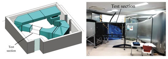 The HLWT at Chiba University has a test section of 1 m, 1 m, and 2 m [L × W × H] and is capable of achieving a smooth airflow (≤2% turbulence) ranging from 0.5 m/s to 11.0 m/s []; see Figure 3. Flow velocities were monitored using a hot-wire anemometer inserted into the cross-section of the tunnel. A similar insert box to that used in the RAWT was manufactured to provide nominally two-dimensional flow. The insert box, shown in Figure 4 (right), had dimensions 1.2 m, 0.42 m, and 0.98 m [L × W × H].