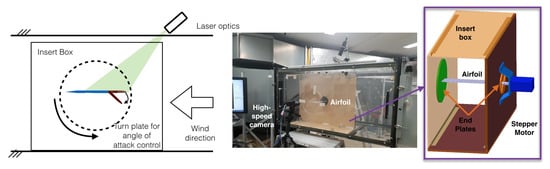Near-field flow structures around the airfoil were measured with a PIV system equipped into the test section; see Figure 4. The airfoil was located horizontally at the center of the test section with its angle of attack controlled by the turn-plate. The suction surface of the airfoil was illuminated by a laser light generated by a Nd-YAG pulsed laser system (LDP-100 MQG, 532 nm, Lee Laser, Inc., USA), which was guided to the top of the test section via an optic fiber and then diverged into a two-millimeter-wide band sheet via a cylindrical lens. As a tracer particle, DEHS (di-2-Ethylhexyl sebacate) mist was sprayed in the wind tunnel at a diameter of approximately 1 m by a particle generator (PivPart14, PivTech GmbH, Germany). The laser sheet was produced with a pulse separation interval of 120 s for a wind speed of 4 m/s. To ensure that the testing conditions remained similar at both wind tunnels, a chord-based Reynolds number was maintained from tunnel velocity and atmospheric conditions. When the blockage ratio is greater than 3–5%, appropriate blockage correction needs to be applied. In this case, the cross-sectional area of the RAWT and HLWT are 1.43 and 2 , respectively, while the maximum frontal area of the models is 0.031 and 0.035 , which gives a solid blockage ratio of ≤2% (even at maximum airfoil and control surface deflection). Thus, no blockage correction was deemed necessary.