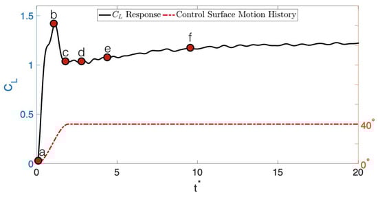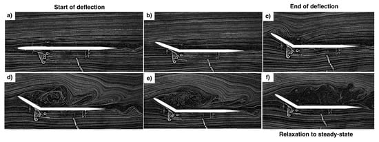 Figure 9 shows the time-varying when deflecting an LECS from to at . An increase in lift is noticed immediately after the LECS begins to deflect (Figure 9), much like in the case of TECS. Snapshots from smoke flow visualization experiments, presented in Figure 10, show that once the control surface begins to move, the flow conforms to the changing geometry and remains attached. Once the control surface reaches the full deflection, the shear layer rolls up on the upper surface of the airfoil to create an LEV, which grows in size as it convects across the airfoil. This presence of low-core pressure on the top surface can be related to the initial lift peak in Figure 9 (a–c). Concurrently there are also vortical structures that begin to form around the hinge on the bottom surface, which creates a negative lift component. Note that a region of re-circulation was found on the airfoil at higher deflection angles during the time-averaged analysis of statically deflected cases, presented in the static analysis paper []. This occurrence of bottom-surface suction can be correlated to the lift being generated in the opposite direction in Figure 9 (d–f).
