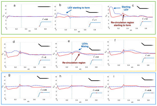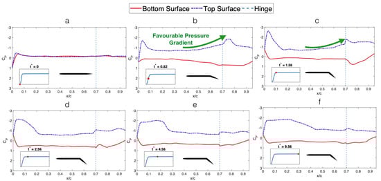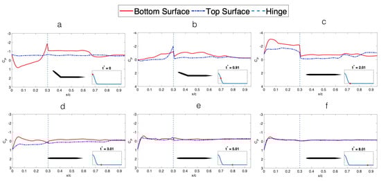 The distribution during LECS deflection at the same rate of is shown in Figure 11. At an undeflected position, the distributions over the top and bottom surfaces of the airfoil are identical, as expected nominally; see Figure 11a. As the deflection begins, the suction peak on the top surface gradually increases to the end of the deflection. The shear layer beings to roll up and starts forming an LEV, shown by the peak in on the top surface in Figure 11b. This correlates well with the formation of the LEV seen from Figure 10. After the maximum peak, then reduced to approximately 0.25. Figure 11d–f shows that this is due to a significant reduction in suction pressure. This is due to the LEVs convecting far away from the top surface of the airfoil. There is a region of re-circulation that starts forming around the hinge on the bottom surface, shown by the peak in on the bottom surface of the hinge (Figure 11d–f), indicated by small changes to the bottom pressure. However, the largest contribution to lift remains dependent on the upper surface. There is then a small positive trend of seen between = 2.7 and 3.2. This is again due to an increase in the suction pressure on the top surface. A suction peak forms at the hinge on the bottom surface, creating a favorable pressure gradient on the bottom surface. Hence, the flow remains attached on the bottom surface throughout most of the transient motion.