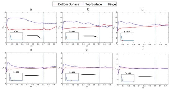 Figure 7 shows the chord-wise pressure distribution at various stages of the control surface deflection measured using the techniques described in Section 2.3. Before the motion starts, there is a typical distribution where the top and bottom surface pressures are nearly identical, and the stagnation pressure is at unity; see Figure 7a. As the deflection begins (see Figure 7b), the on the top surface decreases and increases on the bottom surface with the development of a favorable static pressure gradient on the top surface during the control surface deflection. Thus, the flow remains momentarily attached despite the high deflection angles; see Figure 7c. This was also seen in the PIV and smoke flow visualization experiments by Mancini and Rennie [,]. The largest pressure difference between the top and bottom surface is created just past halfway of the deflection history. This correlates well with the largest peak noticed in Figure 6. Figure 7b,c also show that the pressure decreases () on the upper surface, approaching the hinge location, where the attached flow experiences a sharp turn down the control surface (acceleration due to control surface geometry). Following the end of the control surface motion, the distribution on the top surface gradually flattens just aft of the leading edge; see Figure 7d–f. This suggests that the attached flow gradually separates aft of the hinge and relaxes to a steady-state condition.
