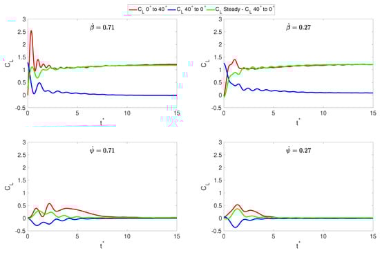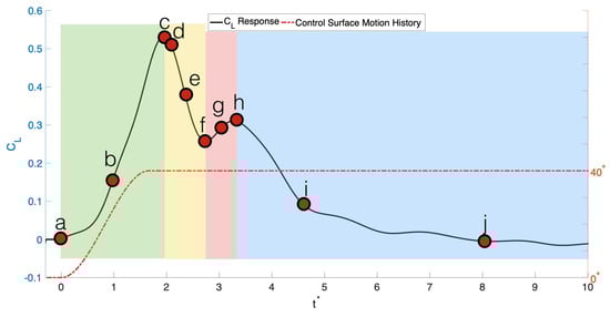 Figure 18 summarizes the response for TECS and LECS when deflecting from attached flow case to separated flow case (red) and vice versa (blue). The green line on the figure shows the difference in lift response between steady state and transition from separated to attached flow case. Classical aerodynamic theory using methods of linear superposition would predict a similar result between control surface deflections from to and to ; however, we see here that this is not the case. It is hypothesized that the differences (green line in Figure 18) arise from the fact that the case of control surface deflection from to begins its motion from a fully developed steady state, whereas the case of control surface deflection from to experiences a brief period of “inviscid effectiveness,” where it reaches a maximum steady circulatory lift contribution. This is evidenced by the large overshoot of the green curve at early times (). When approaching the steady-state condition, the green line converges to the steady value at around 6 for both TECS and LECS; see Figure 18. Thus, it can be concluded that when the end state is attached flow, relaxation to the steady state is relatively faster.
