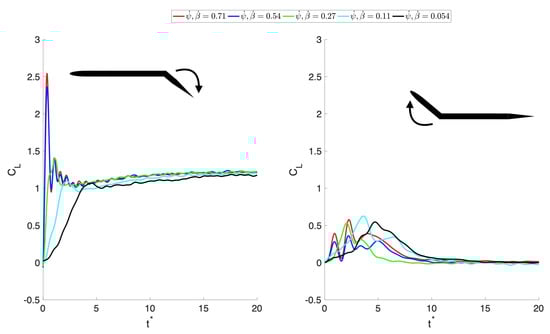 Theodorsen’s unsteady aerodynamic theory suggests that the transient peak produced within a relatively short convective time during TECS deflection arrives from the deflection rate-dependent lift sources (virtual camber and rotation-induced normal acceleration) and added mass []. Thus, the relationship between the magnitude of these peaks to the deflection rate will be investigated in the latter sections.