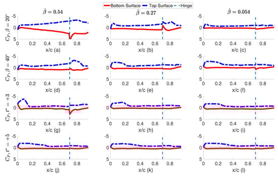 Figure 14 shows the pressure distribution over the airfoil during various stages of the TECS deflection (top to bottom) and various deflection rates (left to right). For the case of (left column), it is observed that a favorable pressure gradient exists on the top section during the deflection, which keeps the flow attached to the control surface during the deflection. As the control surface approaches the end of its deflection (subplot d), the area between the top and bottom surface reduces. Post-deflection, the flow on the top surface begins separation (shown by the flat pressure distribution on subplot g) and eventually relates to the steady-state (subplot j). At the higher actuation rate, the area between the top and bottom surface is greater, resolving to a larger transient .