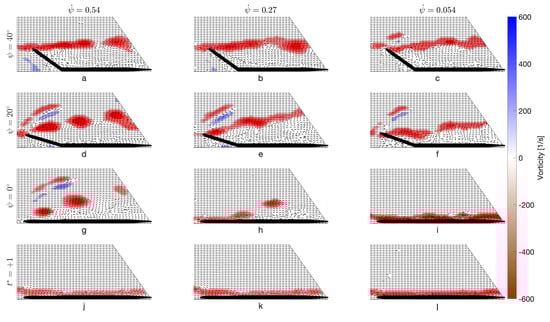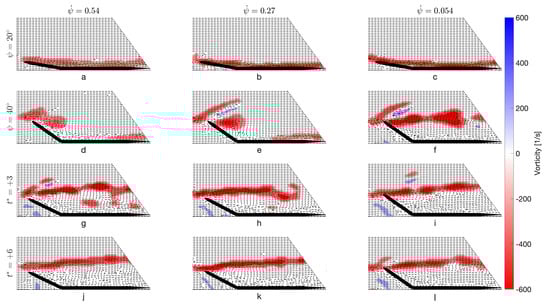 PIV vorticity fields of LECS deflection from to at various deflection stages (top to bottom) and rates (left to right).