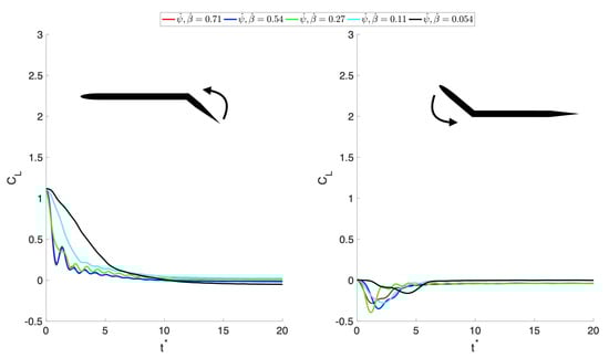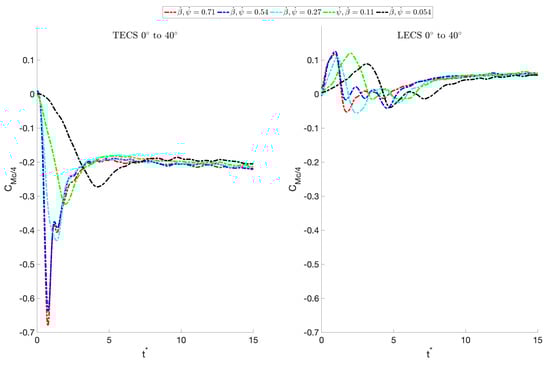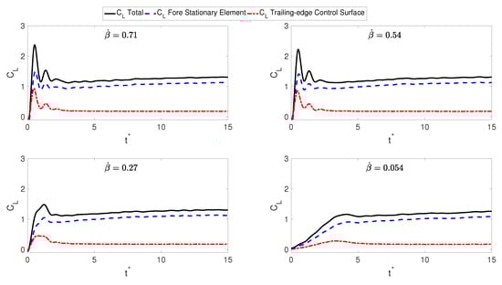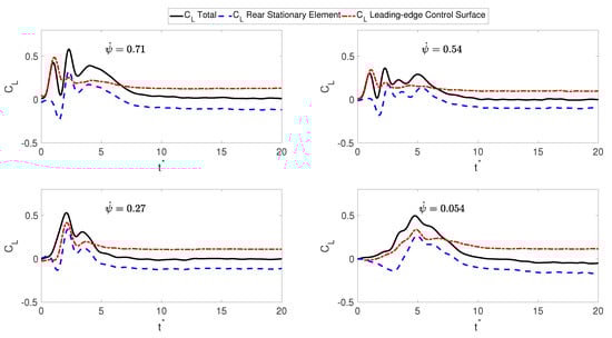 In the case of LECS, the initial lift spike can be attributed almost exclusively to the LECS at sufficiently high actuation rates (>0.54); see Figure 21. At lower actuation rates, there exist significant contributions to the transient lift by the stationary rear element as well. Contrary to the case of TECS, the stationary element has a significant contribution to the steady-state lift as well. Thus, the resulting global lift peak can be attributed nearly equally to both the active LECS and the rear stationary element contributions. Furthermore, in the case of LECS, there is no clear relationship between and deflection rates, much like seen in the case of . Irrespective of the deflection rate, there is initially a positive , which then reverses and eventually relaxes up to a positive just above zero.