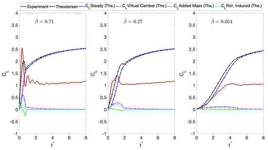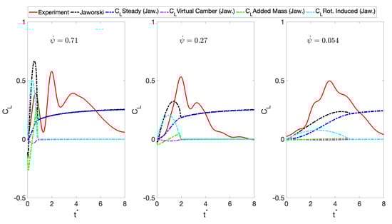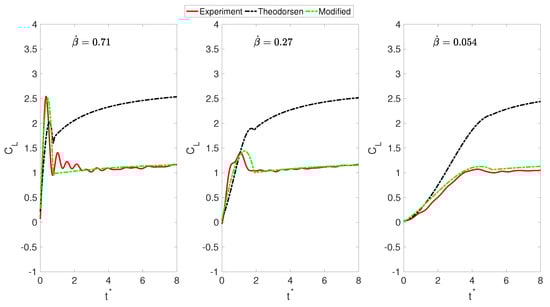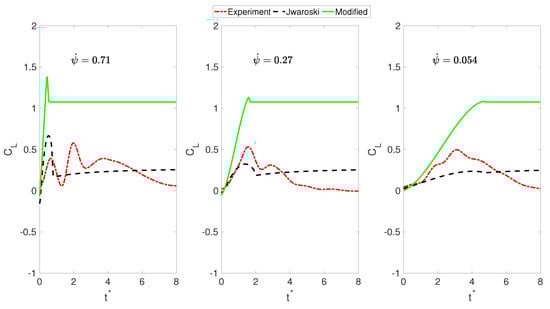 Figure 25 shows a comparison of from experimental data, Jaworski’s solution, and a modified model. It is clear that the modified approach cannot be applied for the case of LECS to predict transient . The modified approach, where the control surface and the stationary element are treated as two separate elements, ignoring all coupling effects between them, shows significant disparity with the experimental results. This is unlike the case of TECS, where the modified approach improved the accuracy of estimating the lift response over Theodorsen’s solution.