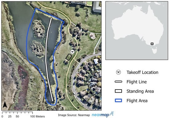 Map of the study area at the Williamstown Rifle Range (also known as Jawbone Coastal Reserve), Melbourne, Victoria, Australia. The approximate center of the survey pond is located at −37.861215, 144.875422. The map depicts the perimeter of the survey pond (Flight Area), the flight path used for repeat overhead drone flights (Flight Line), the location of ground personnel for piloting drones and monitoring waterbird responses (Standing Area) and the location that the drone was launched from (Takeoff Location). The map was generated by T.A.D. using ArcGIS Pro 3.0.3, Redlands, CA, USA.