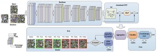 The obtained descriptor, along with the category information, is fed into the classifier to generate the final classification result. The cross-entropy loss function is employed to calculate the loss between the classification result and the category, and an iteration is performed during the training process to optimize the loss function. During the evaluation, query descriptors obtained through the aggregation layer perform a strong L2 distance search in database descriptors obtained through the aggregation layer to obtain predicted results. For real label data, real query labels perform K-nearest neighbors (KNN) searches on real database labels to obtain real query results. Finally, it is judged whether the predicted result exists in real query results to obtain the discriminant result. Various search methods are employed to predict descriptors and labels due to their distinct representations and task characteristics. Utilizing L2 distance for searching similar descriptors effectively identifies database descriptors that align with the query descriptors, resulting in more accurate descriptor predictions. On the other hand, the KNN search for labels allows the algorithm to determine the final label prediction through a voting mechanism involving multiple closest database labels, thus enhancing the stability and robustness of label predictions. By employing different search methods, the AGCosPlace algorithm can comprehensively leverage the information within the database, consequently enhancing the algorithm’s accuracy and performance. The architecture of the AGCosPlace network is illustrated in Figure 1.