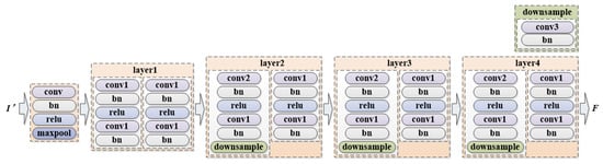 In each of the five modules, several operations are performed to process the input image I′. These operations include 2D convolution (conv) with a kernel size of 7, a stride of 2, and a padding of 3; Batch Normalization (bn); max pooling (maxpool) with a kernel size of 3, a stride of 2, a padding of 1, and a dilation of 1; 2D convolution (conv1) with a kernel size of 3, a stride of 1, and a padding of 1; 2D convolution (conv2) with a kernel size of 3, a stride of 2, and a padding of 1; and a downsample module composed of a 2D convolution (conv3) operation with a kernel size of 1, a stride of 2, and Batch Normalization (bn). Additionally, the rectified linear unit (relu) activation function is applied within the module.