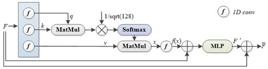 q and k represent the queries and keys, respectively. The softmax function is applied to normalize the attention scores. Additionally, 128 represents the dimension of the keys. By computing the attention scores, a weighted sum of the values (v) based on the attention weights is obtained. This allows the network to focus on important features and capture contextual information. The output of the self-attention operation is a refined representation of the feature map F, which incorporates both local and global dependencies. It is worth noting that the self-attention operation is performed across multiple heads (4 heads) to capture different relationships and enhance the overall representation power of the network.
