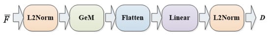 After the GeM pooling, the resulting pooled features are flattened and passed through a fully connected layer. This fully connected layer has an output dimension of 512, which means it transforms the features into a 512-dimensional representation. After the Flatten and Linear operations, an normalization is performed on the obtained descriptor to normalize its magnitude. The descriptor D can be mathematically represented as follows:
