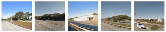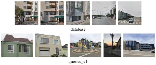 Considering the SF-XL dataset training set, it consists of a substantial 41.2 million images, amounting to approximately 1TB in size. This poses a significant challenge due to the sheer volume of data involved. Thus, our training set consists of a subset of the SF-XL dataset; the number of images is 59,650, the number of groups is 1, the number of images per category is 10, and the number of categories is 5965. Test Set: The database size is 27,191 images, and the query size is 1000 images. Verification Set: The database size is 8015 images, and the query size is 7993 images. UAV Test Set: The database size is 533 aerial images, and the query size is 93 aerial images. Figure 7, Figure 8 and Figure 9 represent examples of the training set, the test set, and the verification set. Figure 10 provides an example of the UAV test set, which includes aerial images of 292 buildings obtained from Google Earth Pro software 1.3.36.242.
