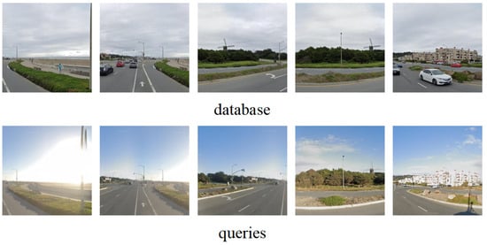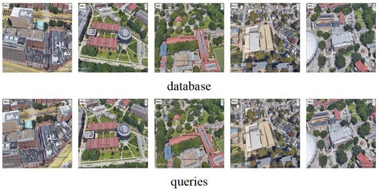 To construct the training set, a subset of SF-XL with a latitude range of 37.70 to 37.81 was chosen. In Figure 7, five street scenes from the training set are presented, each corresponding to latitudes 37.70, 37.71, 37.72, 37.73, and 37.74. These examples illustrate that the training set encompasses diverse scenes, including variations in illumination conditions. For the test set, the database comprises 27,191 images that cover the entire geographic area of SF-XL in 2013. Figure 8 showcases five schematic diagrams from the database, revealing a mixture of street and building images. Furthermore, the database incorporates images of the same building captured from different perspectives. The test set comprises 1000 query images collected from Flickr, intentionally selected from a distinct domain to closely resemble real-world scenes. Figure 8 exhibits five query images, indicating that they also contain a combination of street and building scenes. To form the validation set, a set of images throughout the city, encompassing 8015 database images and 7993 query images, was chosen. In Figure 9, five database images exhibiting different street views, along with five query images displaying varying illumination conditions within the same scene as the database, are presented. For the UAV test set, the Google Earth Pro software was utilized to capture images of 292 buildings, ensuring they had similar perspectives to those in the University-1652 drone dataset [41]. Each building was photographed from two different perspectives, which were subsequently divided into database images and query images for the drone test set. Some of the query images also have images with the same perspective as the database images. Furthermore, the image obtained by Google Earth Pro can also obtain the kml file containing the image coordinate information. The kml file obtained from Google Earth Pro contains image coordinate information, including longitude, latitude, and heading data. This information is leveraged to generate retrieval labels for the UAV test images. To obtain the retrieval labels, the kml file’s longitude, latitude, and heading details are used. An online conversion tool is employed to derive the UTM coordinates from the latitude and longitude coordinates. Consequently, five retrieval labels for a UAV image are obtained, comprising UTM coordinates, latitude and longitude coordinates, and heading information. Figure 10 showcases five database images exhibiting distinct buildings, alongside five query images captured from various rotation angles, all within the collected UAV test set.