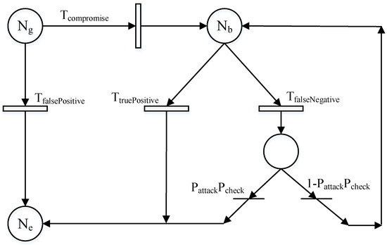 The SPN model is initially set up with all nodes being good nodes, and tokens are placed in . Due to the invasion of attackers, every node has a probability of being captured and transformed into a bad node. This is modeled by relating the transition . Firing will move tokens from place to place one at a time. The tokens in place represent compromised nodes that are not detected.