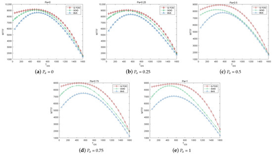 The results depicted in Figure 3 illustrate the superior performance of the Q-TCID algorithm over the basic voting strategy (BVS) proposed in [11] and the single-layer optimized intrusion detection algorithm (SOID). The MTTF values obtained using Q-TCID are consistently higher under different attack probabilities (), indicating that Q-TCID is more efficient in detecting and defending against malicious nodes in IoD systems. This algorithm is especially effective when the values are small (e.g., from 50 to 250), as it leverages Q-learning to optimize the intrusion detection strategy, thereby reducing the probability of false positive and false negative. In addition, when the frequency of intrusion detection is higher, the advantage of Q-TCID is more obvious.