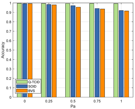 Figure 4 shows the comparison of Q-TCID with the basic voting strategy (BVS) [11] and the single-layer optimized intrusion detection algorithm (SOID). It can be seen that the identification accuracy of BVS and SOID decreases with the increase of the attack probability of malicious nodes. In contrast, Q-TCID demonstrates strong adaptability to the attacks of malicious nodes, with little difference in recognition accuracy under different attack probabilities of malicious nodes. Overall, the improved intrusion detection algorithm achieves higher recognition accuracy and better intrusion detection performance when compared to BVS and SOID.