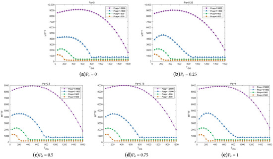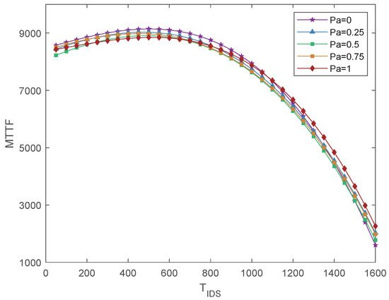 Figure 6 shows the impact of various attack probabilities on MTTF. It is evident from the plot that there is an optimal value for , which maximizes the MTTF. This optimal value achieves a balance between the energy consumption during audits and the effectiveness of defense measures in prolonging the system’s lifetime. When is too small, intrusion detection occurs too frequently, resulting in excessive energy consumption and a short running time of the IoD system. With the increase of , the system can save more energy and extend the network running time. However, when is too large, although it can save more energy, the system cannot catch malicious nodes in time, which leads to an excessive proportion of bad nodes, leading to Byzantine failure.
