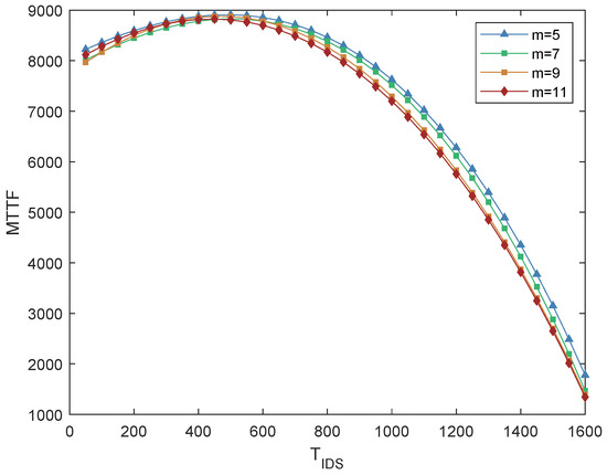 Figure 9 shows the influence of per-node capture rate on MTTF under different attack probabilities of malicious nodes. A larger means that the good nodes are more likely to be captured maliciously, and the proportion of malicious nodes in the system is greater. Therefore, when increases, the MTTF of the system decreases. Moreover, as rises, the optimal value that maximizes MTTF also increases. This is because when the per-node capture rate is higher, there is a higher possibility that there will be more malicious nodes in each IDS voting cycle that need to be correctly judged and evicted from the system. If the IDS voting interval is too long, it raises the risk of Byzantine failure, which occurs when at least one third of the nodes are malicious.