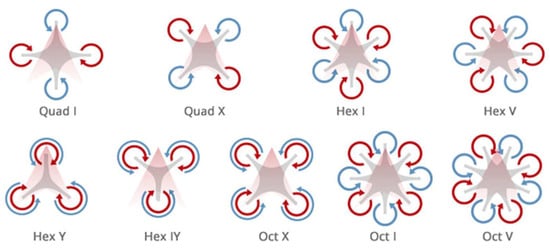 Drones are used in surveillance and reconnaissance missions, as well as for aerial attacks []. They are also used for inspections of critical infrastructures (such as power lines or oil platforms), package deliveries, mapping and topography work, inspections, the mapping of mines, monitoring of crops and construction sites, and capture of images and videos for artistic or documentary purposes []. There are various types of drones, which vary in design, size, and capabilities [,]. Multirotor drone can take off and land vertically []. Drones are further classified into several subtypes depending on the number of rotors []. Another type of drone is the fixed-wing drone, which often resembles conventional airplanes. These UAVs are generally larger than multirotors and are often used for surveillance and reconnaissance tasks across large areas [].