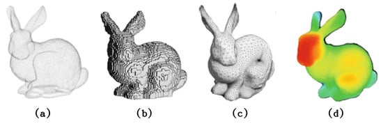 Four of the five possible three-dimensional representations of the Stanford Bunny model. (a) Point cloud representation. (b) Volumetric representation. (c) Polygonal mesh representation and (d) Depth map representation. Image by Elena Camuffo et. al., 2022 [].