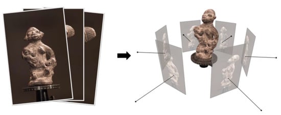 Multi-view stereo (MVS) is an advanced computer vision technique that enables the three-dimensional reconstruction of a scene or object from multiple images taken from different viewpoints. Inspired by stereo vision, MVS extends this approach by utilizing several images captured from different angles and positions, resulting in a more precise and detailed 3D representation (see Figure 3 []). MVS algorithms employ correspondence and optimization techniques to identify and relate feature points in the images and estimate their three-dimensional position in space [].